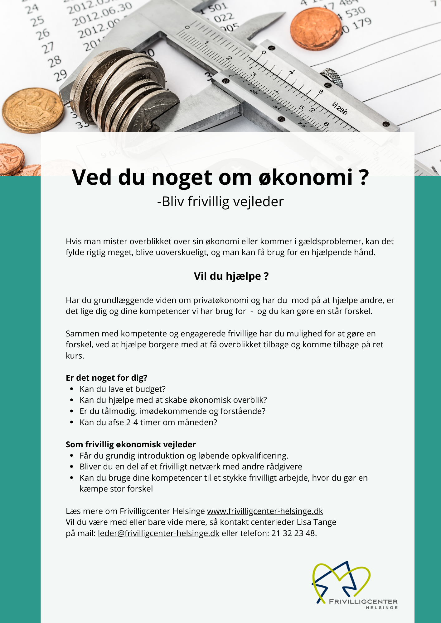 I Frivilligcenter Helsinge kan du få gratis, fortrolig og uvildig vejledning, uanset om du har et enkelt spørgsmål eller står midt i en svær økonomisk situation.